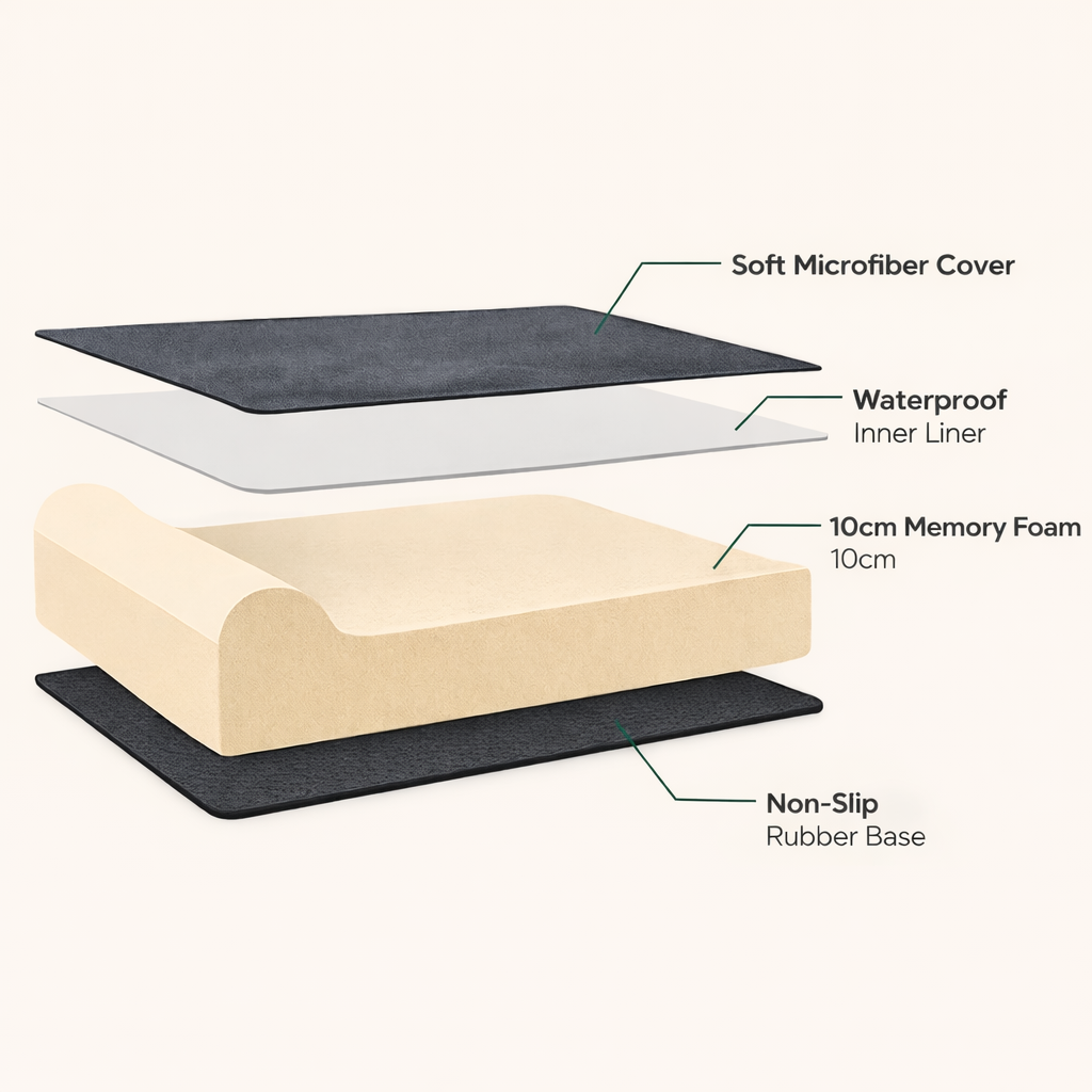 PawRest was designed for dogs who wake up stiff, struggle to stand, or can't find a comfortable position at night. Our 10cm orthopaedic memory foam moulds to your dog's unique shape, cradling sore joints and distributing weight evenly.